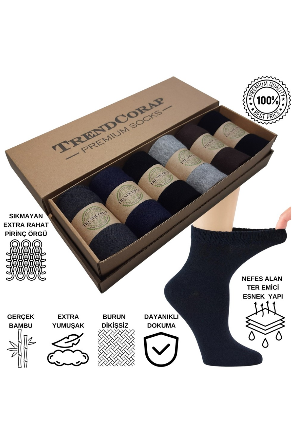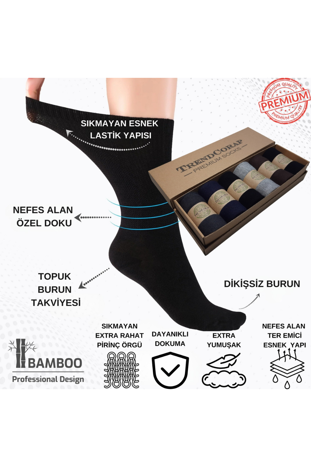 TrendCorap Premium Diabet Bambu Erkek Şeker Çorabı, diyabetik ayaklar için özel olarak tasarlanmış, şıklığı ve konforu bir arada sunan bir üründür. Bambu liflerinden üretilen bu çoraplar, doğal özellikleri sayesinde antibakteriyel özellik gösterir, ayakları kuru tutar ve kötü kokuları engeller. Ayrıca, bambu malzeme, cilt dostu olup hassas ayaklar için mükemmel bir seçenek sunar.